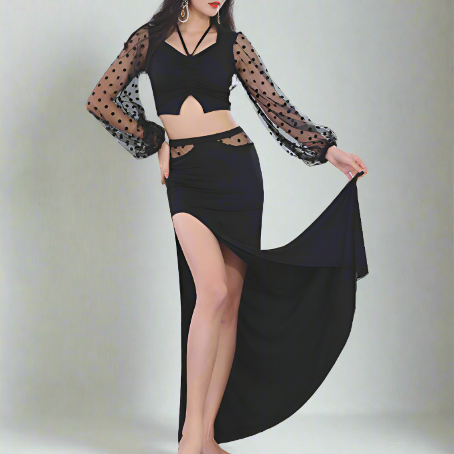 A black suit featuring a crop top with sheer raised polka dot balloon sleeves. The long skirt with a single slit includes cutouts in the midsection adorned with matching polka dots.