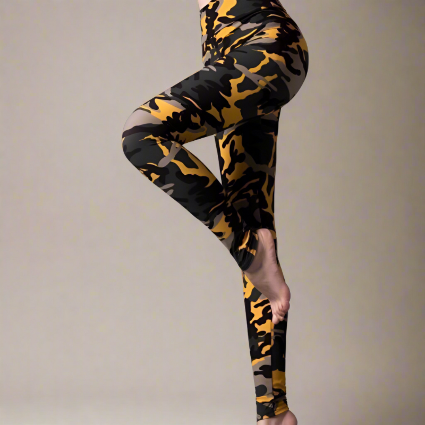 High-waisted leggings featuring a camouflage pattern in shades of yellow, black, and brown