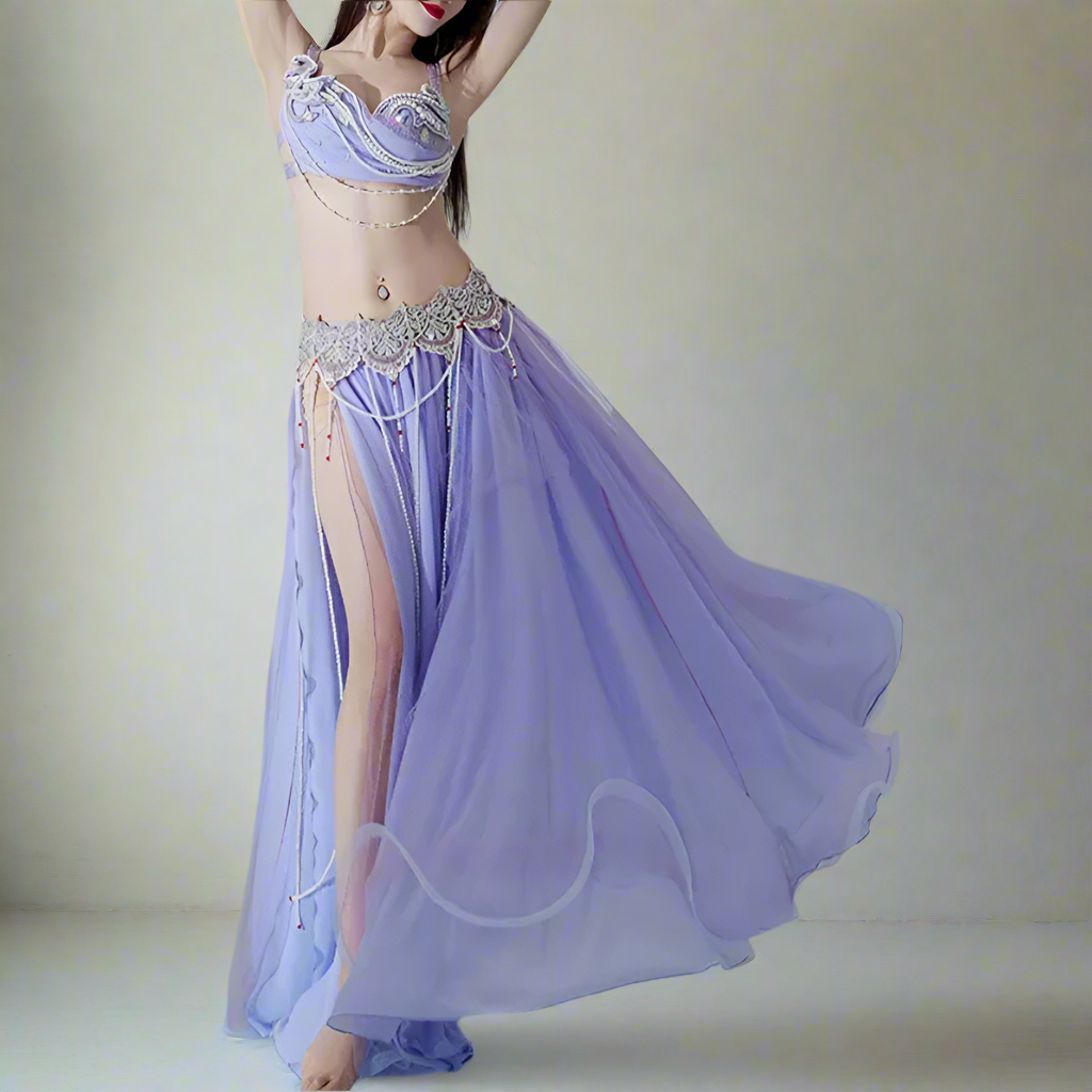 NUSIRA custom sequinned soft lavender halter bra skirt belly dance set combo