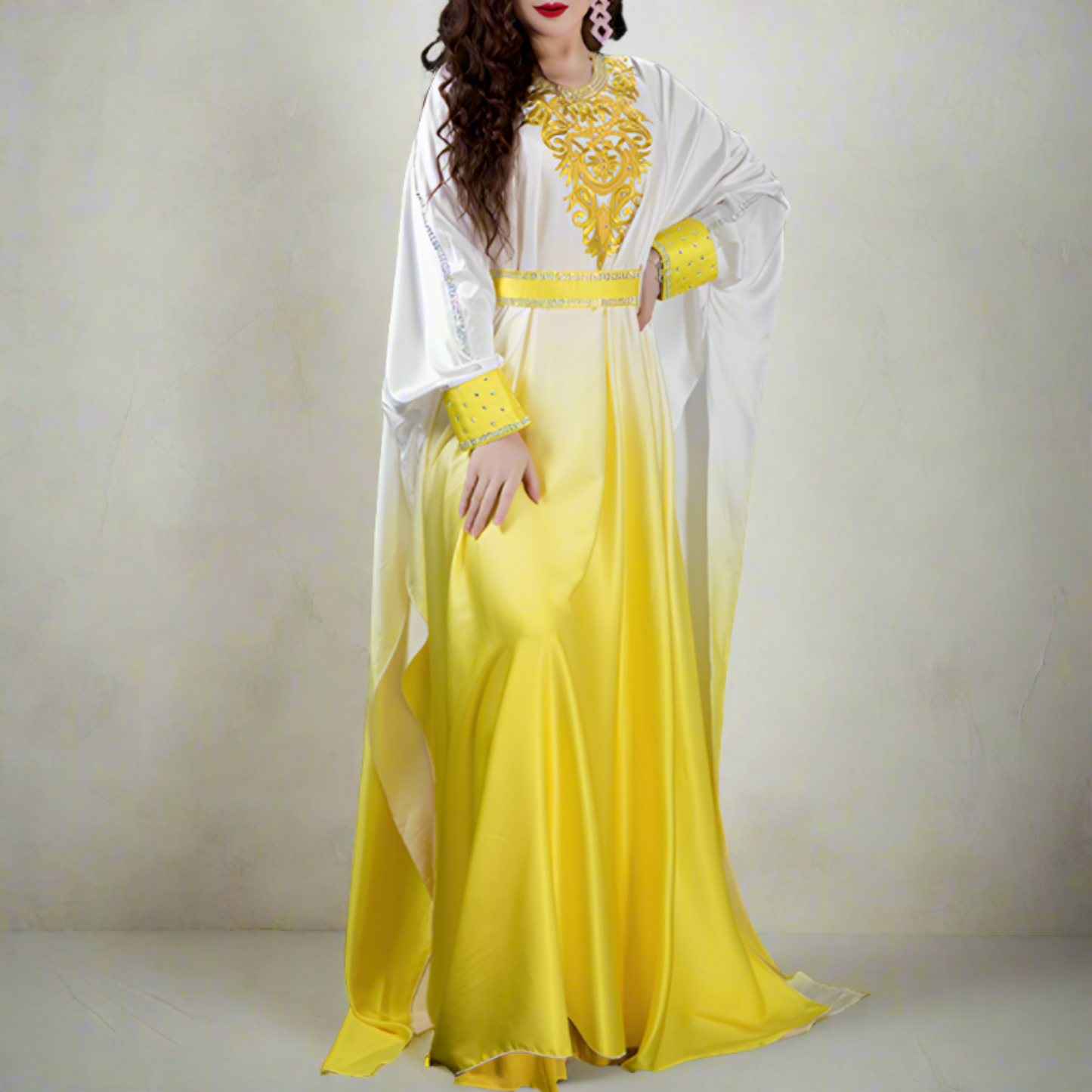 The Khaleegay-style gown showcases a yellow and white gradient, crafted from smooth chiffon and adorned with detailed embroidery. It's embellished with gold sequins, AB rhinestones, and beading accents, featuring caftan-style sleeves